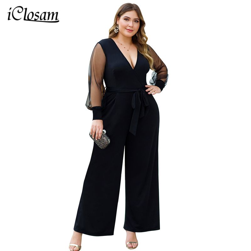 2020 Iclosam Black Plus Size Jumpsuit Mesh Long Sleeve Wide Leg